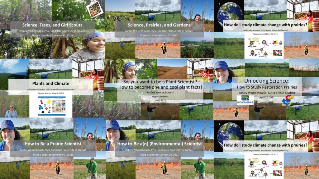 COVID-19 times had made in-person outreach rather tricky, but I discovered the amazing nonprofit educational organization called Skype A Scientist to connect me with classrooms, scout troops and individuals interested in science! I have been so enriched by my experience being a volunteer scientist since January 2020. I have been matched with as many as five “classrooms” a semester with students that span all ages (K-12, college, and the public). I gear all my presentations towards the interests and questions I receive from the students prior to my time with the “classroom”. These questions range from my person background that lead me to be a scientist, the ecosystem of the tallgrass prairie, plant biology/ecology in general and anything else in between. I have been matched now with ~40 classrooms from across the United States and international classrooms from Canada, China, Guatemala, and Russia!